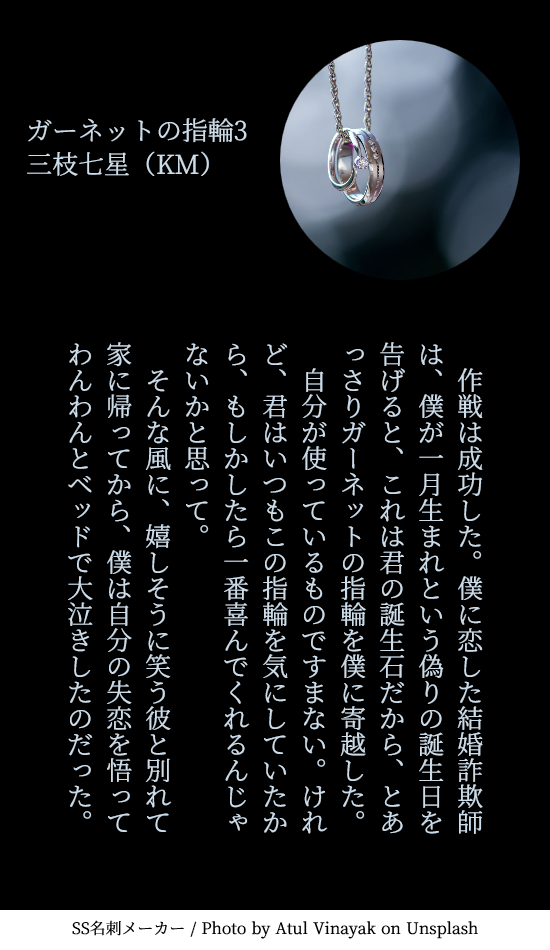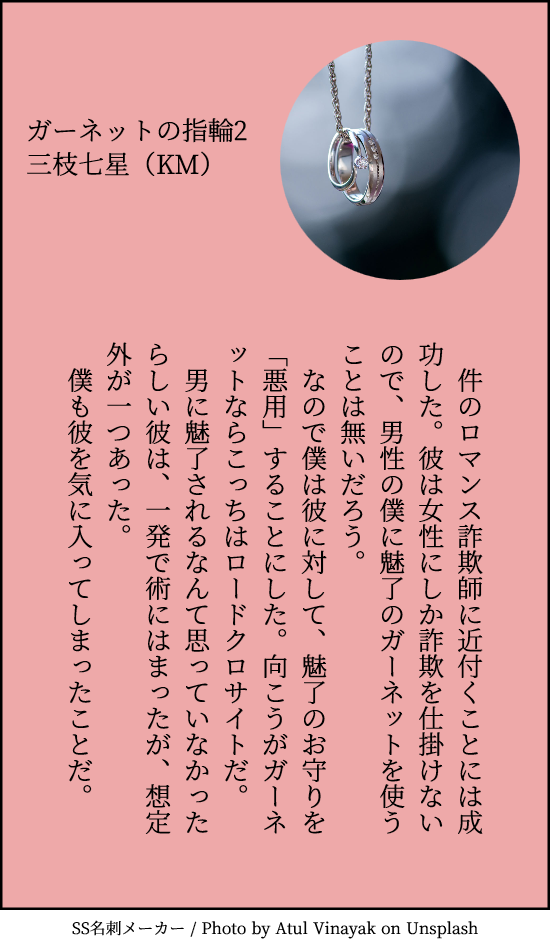 [PR] ×[PR]上記の広告は3ヶ月以上新規記事投稿のないブログに表示されています。新しい記事を書く事で広告が消えます。 ガーネットの指輪続き 月3本チャレンジ2月度2、3本目。こないだのガーネットの指輪の続き。 ロマンス詐欺師を騙し返す話。人を呪わば穴二つって奴ですね。 [0回]PR コメント