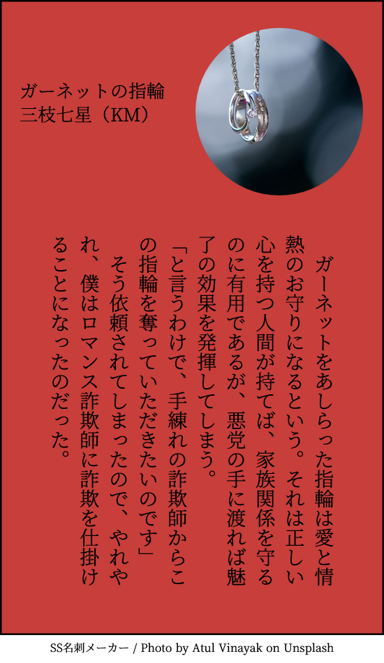 [PR] ×[PR]上記の広告は3ヶ月以上新規記事投稿のないブログに表示されています。新しい記事を書く事で広告が消えます。 ガーネットの指輪 月3本チャレンジ1月度3本目!続きから。 本当はアルファポリスで連載しようとしている誕生石アイテムに入れようと思ってたんですが、固まらないうちに1月が終わろうとしている。結婚詐欺師と殺し屋のBLとかのネタは実はあるんですけどなんんか上手いこと固まらないんですよね。 [0回]PR コメント