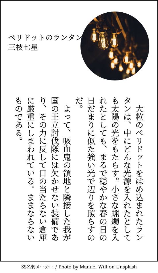 [PR] ×[PR]上記の広告は3ヶ月以上新規記事投稿のないブログに表示されています。新しい記事を書く事で広告が消えます。 ペリドットのランタン 誕生石シリーズ8月度。月3本はくるっぷの方に2本投稿しているのでこれで今月分は達成です。 前「王家の宝物庫」でヘリオドールの杖はやったんだけど、ペリドットも太陽関連の宝石らしくて、太陽っぽさをイメージしたアイテムです。太陽光になるランタンならお布団干すのに最適じゃんねと思ったけどファンタジー世界なら吸血鬼退治かな。 [0回]PR コメント