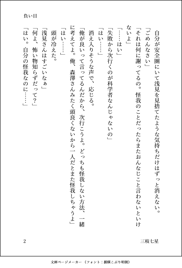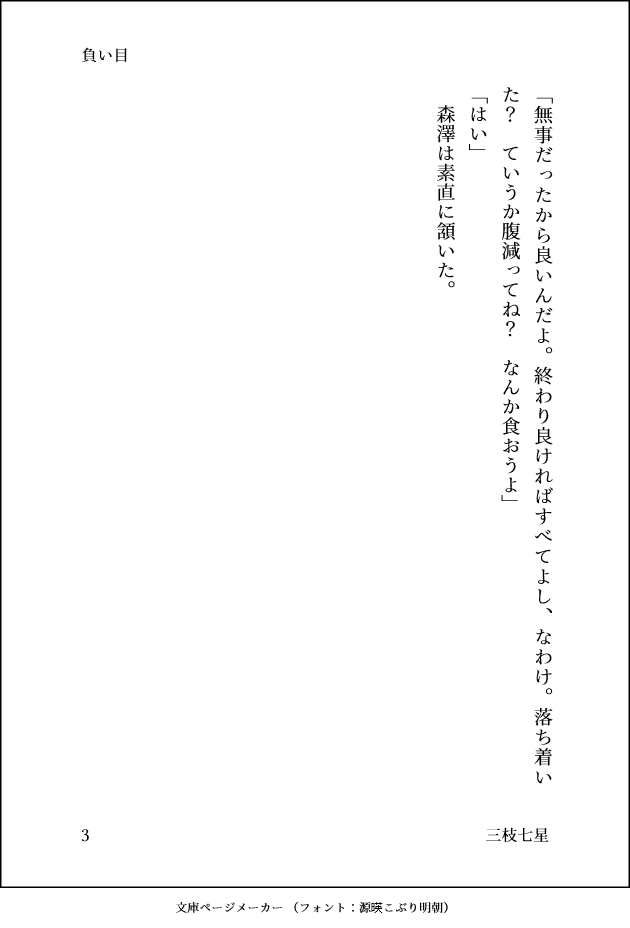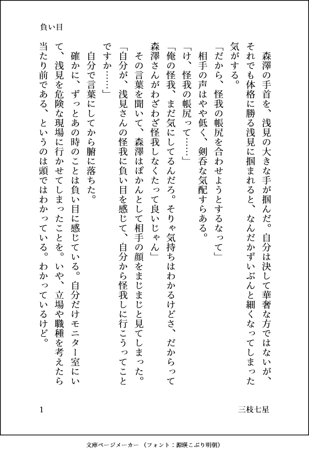 [PR] ×[PR]上記の広告は3ヶ月以上新規記事投稿のないブログに表示されています。新しい記事を書く事で広告が消えます。 負い目 浅見と森澤の習作。くるっぷにもあげたやつです。続きから。 過去記事でも散々言ってる、「森澤は前作で生じた浅見の怪我にすごい負い目を感じている」という話です。自分でも過去作読み返したら、終盤の森澤めちゃくちゃ浅見の怪我に負い目感じてたのでしばらく引きずると思います。過去作はこちら。 [0回]PR コメント